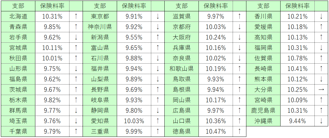 協会けんぽの健康保険料率は、都道府県支部毎に設定されますが、2025年3月分から適用される保険料率は下表のとおりとなりました。